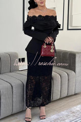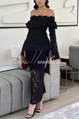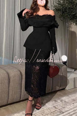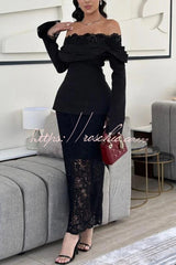 Elegant Patchwork Lace Off-shoulder Pleated Long-sleeved Slim-fit Midi Dress