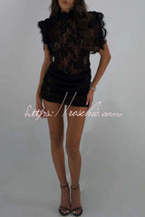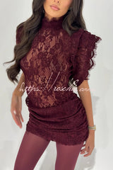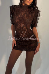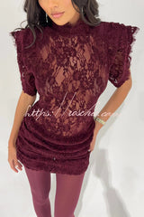 Bold and Alluring Lace High Neck Statement Padded Shoulder Wide Sleeve Ruched Mini Dress