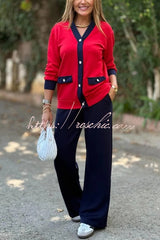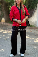 Stylish Color-blocked V-neck Knitted Button-down Cardigan and Elastic Waist Casual Wide-leg Pants Set