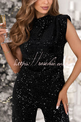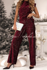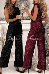 Stylish Sparkly Velvet Sequin Sleeveless Pleated Top and Casual Wide-leg Pants Set