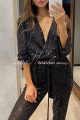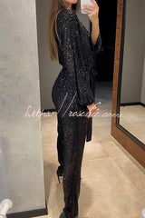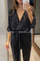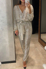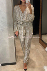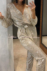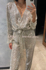 Cheers To You Sequin Long Sleeve Belted Wrap Loose Jumpsuit