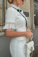 - An incredibly beautiful tweed dress with small sleeves, trimmed with pleats and lace embroidered with pearls, with patch pockets and a cute removable velvet bow, perfect for a special event or for a business meeting.