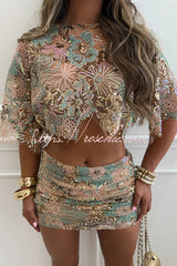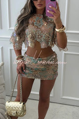 Fashionable Embroidered Flower Sequined Crop Top and Hip-hugging Mini Skirt Set