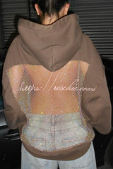 Fashionable Shiny Mesh Hollow Back Loose Long-sleeved Hooded Sweatshirt
