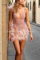 Feather Sling Deep V Neck Party Dress