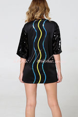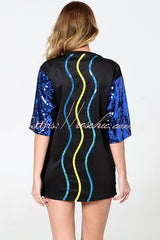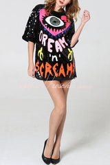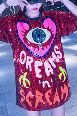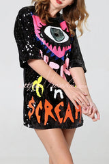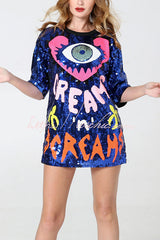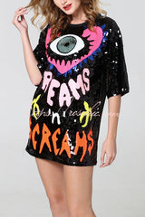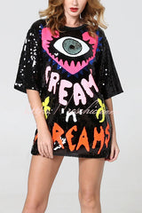 Love Eyes Letters Sequined Round Neck Short Sleeve Mid-Length Loose T-Shirt