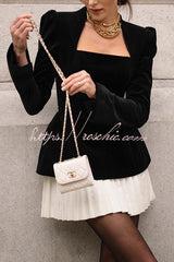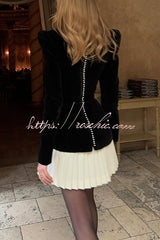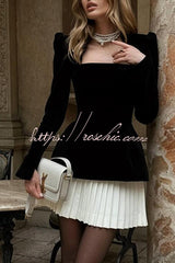 Netta Velvet Square Neck Long Sleeve Back Pearl Detail Pleated Mini Dress