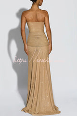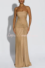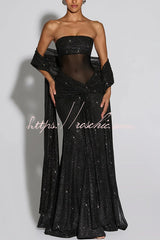 - The Paula sequined maxi dress features an off-the-shoulder design with ruffles at the bust and a sheer front panel for an elegant silhouette. A ruched knot at the waist and a fit-and-flare skirt add a touch of sophistication and elegance.Our distinctive clothing will add instant style to your wardrobe .