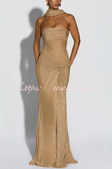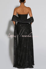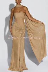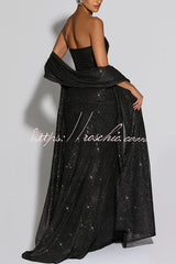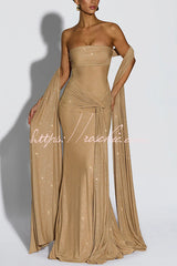 Paula Sequined Mesh and Jersey Off Shoulder Ruched Knot Drape Shawl Maxi Dress