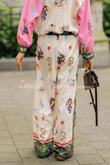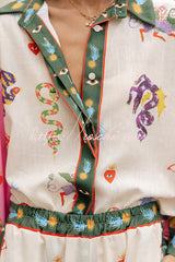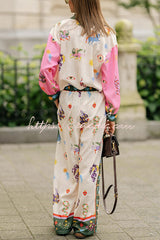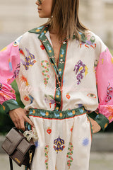 Mystery World Linen Blend Unique Print Loose Blouse and Elastic Waist Pocketed Pants Set