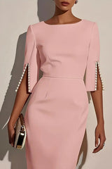 Solid Color Elegant Round Neck Half Sleeve Beaded Decorated Slim Fit Midi Dress