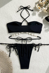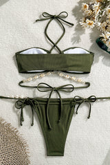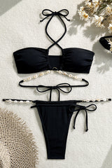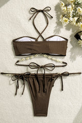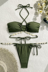 Solid Color Shell Beaded Halter Neck Tie Two-piece Elastic Bikini Swimsuit