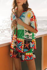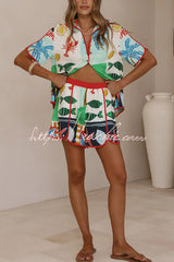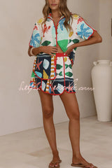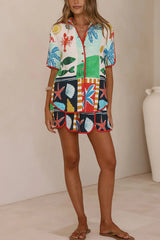 Linen Blend Summer-themed Printed Collared Short-Sleeve Loose-Fitting Shirt and Elastic Waist Casual Shorts Set