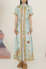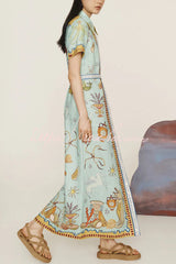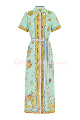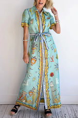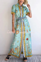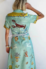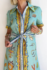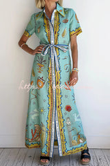 Deep Sea Dreaming Linen Blend Unique Print Short Sleeve Tie-up Shirt Maxi Dress