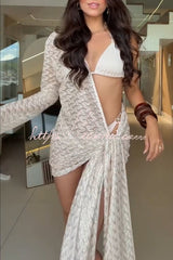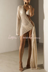Halter Elastic Bikini and Knit One Shoulder Bell Sleeve Tie-up Hem Cover-up Mini Dress Three Piece Set