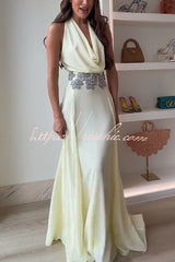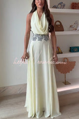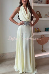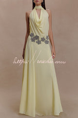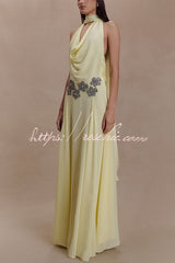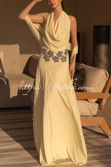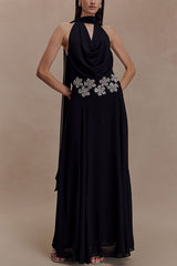 Santal Chiffon Detachable Halter Cowl Neck Scarf Floral Diamante Trims Maxi Dress