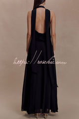 - The SANTAL floral chiffon backless maxi dress features a soft, draped neckline and three buttons at the back. The flowing skirt drapes naturally, exuding an elegant charm. The front of the waist is adorned with sparkling rhinestone trim, adding a touch of glamour, while the detachable scarf at the neck offers versatile styling options.Our distinctive clothing will add instant style to your wardrobe.