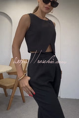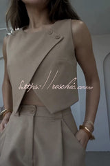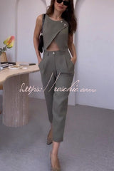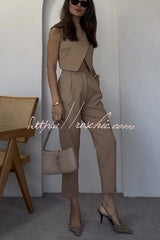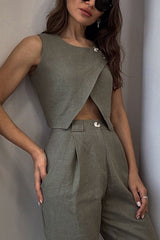Balvin Linen Blend Cross Button Neck Crop Vest and High Rise Pocketed Pants Set
