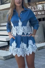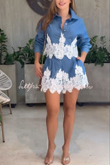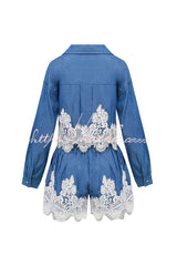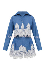 Nasha Denim Lace Trim Button Long Sleeve Shirt and High Rise Pocket Wide Leg Shorts Set