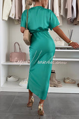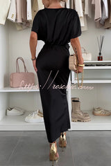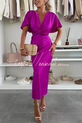 Satin Solid Color V-neck Cross Knot Slim Maxi Dress