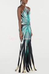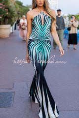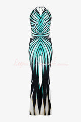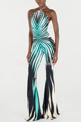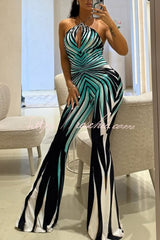 Unique Striped Print Halter Neck Cutout Tie-up Casual Flared Jumpsuit