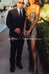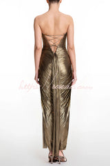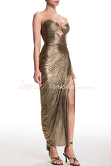 Amisha Metallic Pleated Shell Cups Hollow Gold Pendant Strapless Drape Slit Maxi Dress