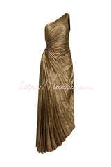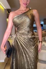 Midnight Kiss Metallic Fabric One Shoulder Cutout Pleated Maxi Dress