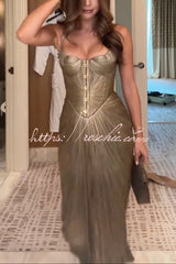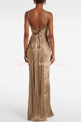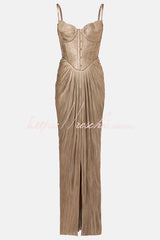 Vegas Queen Metallic Pleated Sculpted Bodice Back Lace-up Drape Maxi Dress