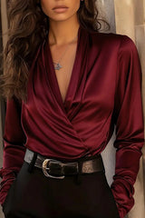 Solid Color Satin V-neck Long-sleeved Elegant Shirt
