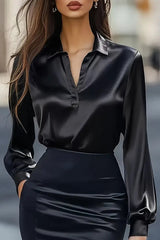 Solid Color Satin V-neck Long-sleeved Elegant Shirt