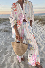 Coral Striped Print Oversized Shirt and Elastic Waist Pocket Pants Set