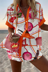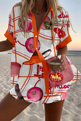 Fun Fruit Print Loose Button Elastic Waist Shorts Set