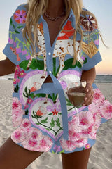 Garden Horse Print Loose Button Elastic Waist Shorts Set