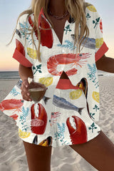 Lemon Fish and Shrimp Print Loose Button Elastic Waist Shorts Set