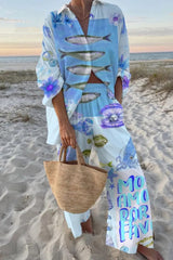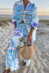 Marine Creature Print Oversized Shirt and Elastic Waist Pocket Pants Set