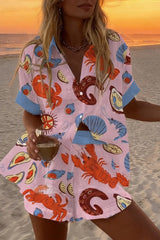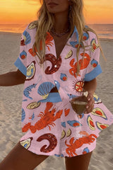 Marine Life Print Loose Button Elastic Waist Shorts Set