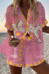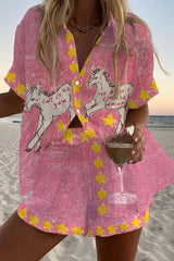 Star and White Horse Print Loose Button Elastic Waist Shorts Set