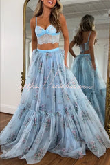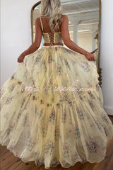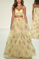 Vita Floral Satin Bow Lace Back Lace-up Crop Tank and Tulle High Rise A-line Maxi Skirt Set