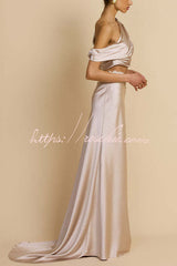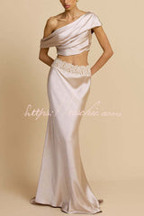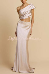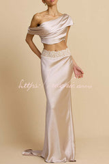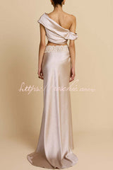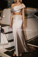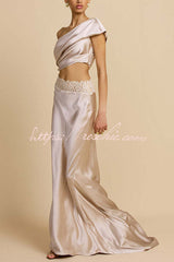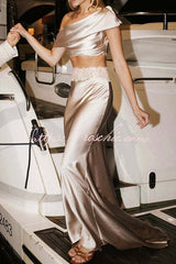 Anaya Satin Asymmetrical Off Shoulder Cropped Top and Lace Trim High Rise Maxi Skirt Set