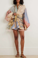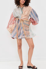 Salie Linen Blend Color-block Stripes Twisted Wrap Long Balloon Sleeve Shirt Mini Dress