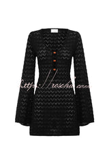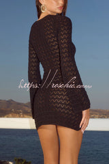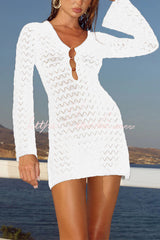 Solid Color Hollow-out V-neck Flared Long-sleeved Slim-fit Knitted Cover-up Mini Dress