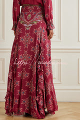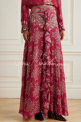 Unique Printed Chiffon Long-sleeved Loose Shirt and Elegant Ruffled Maxi Skirt Set