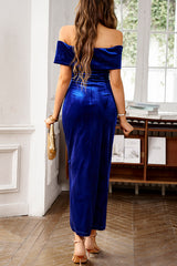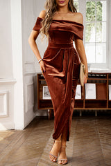Solid Color Velvet Off-shoulder Slim-fit Elegant Slit Midi Dress