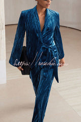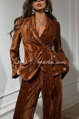 Solid Color Velvet Pleated Long-sleeved Tie Top and Casual Pocket Straight-leg Pants Set