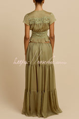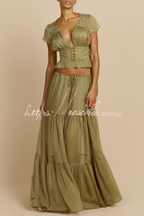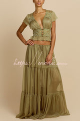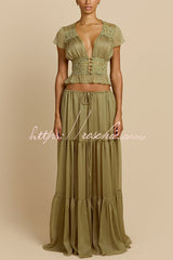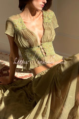 - Sabrina's top features a retro silhouette, crafted from a lightweight, pistachio green chiffon fabric. The deep V-neck and soft pleats at the bust perfectly accentuate the alluring collarbone. Short, ruffled sleeves add a touch of femininity, while a fitted lace bustier outlines a slender waist. The hem is gathered with delicate ruffles, further enhancing its graceful appearance. A matching button at the center front adds a touch of sophistication, and the pleated chiffon drapes naturally over the bustier.Our distinctive clothing will add instant style to your wardrobe.