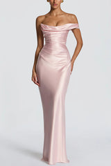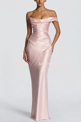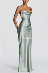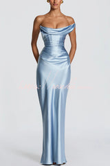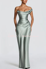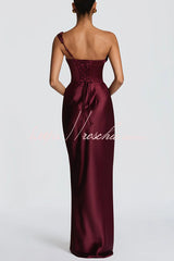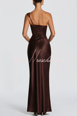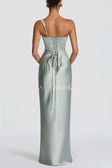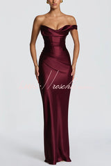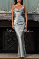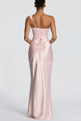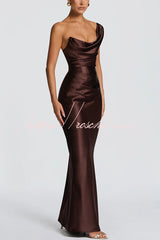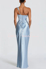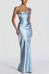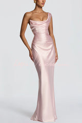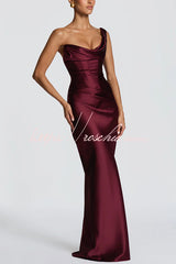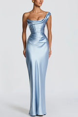 This Thalassa maxi dress is crafted from luxurious non-stretch satin, featuring a striking one-shoulder neckline with pleated drape and an asymmetrical bodice pleated design for added elegance. An integrated corset and tie-back create a flattering silhouette, while the bias-cut skirt cascades gracefully to the floor.Our distinctive clothing will add instant style to your wardrobe. -