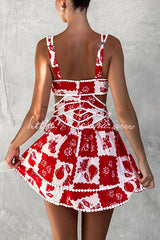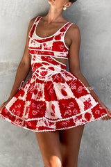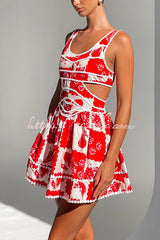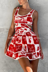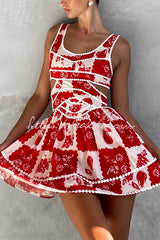 Holiday Colors Ric Rac Trims Unique Print Cutout Round Neck Mini Dress