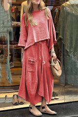Solid Color Loose Round Neck Top and Elastic Waist Tie Casual Maxi Skirt Set