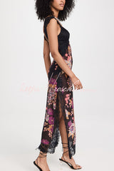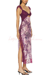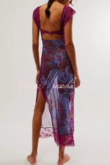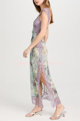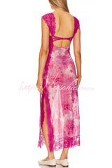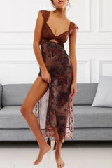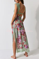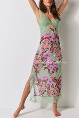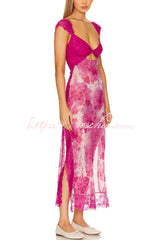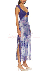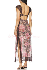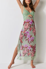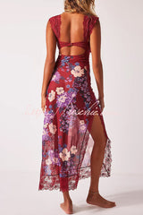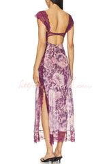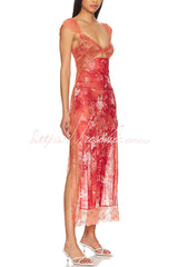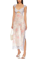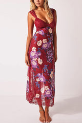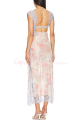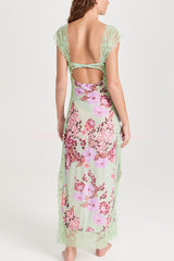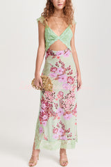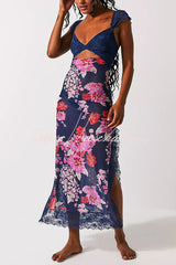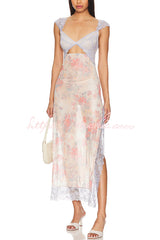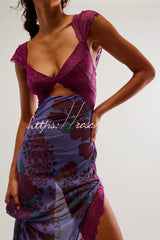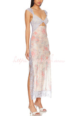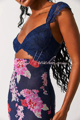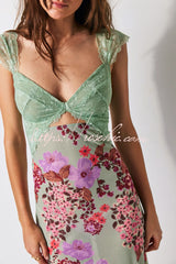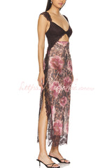 Floral Print Lace Patchwork Hollow-out Slim-fit Midi Dress