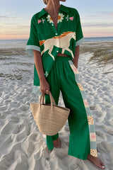 White Horse Print Oversized Shirt and Elastic Waist Pocket Pants Set